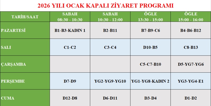 CEZA İNFAZ KURUMUMUZ KAPALI VE AÇIK GÖRÜŞ GÜNLERİ AŞAĞIDA GÖSTERİLMİŞTİR.